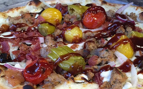 mozzarella, goat cheese, garlic heaven sauce, Sweet Baby Ray’s BBQ sauce, bacon, sausage, onions, pepperoncini’s, roasted tomatoes, rosemary