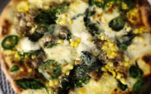 mozzarella, garlic heaven sauce, corn, sausage, spinach, caramelized onions, jalapenos, provolone