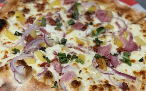 mozzarella, pineapple, ham, bacon, red onion, fresh basil, sea salt